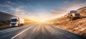 一个以深蓝色为纯色背景的3D风格物流卡车图标,卡车主体为亮橙色,车轮和车窗为白色,车身后部有三条白色速度线以表现动态感,整体采用圆润的几何造型,表面有轻微的光泽质感,简洁现代的设计风格,没有任何文字和二维码。