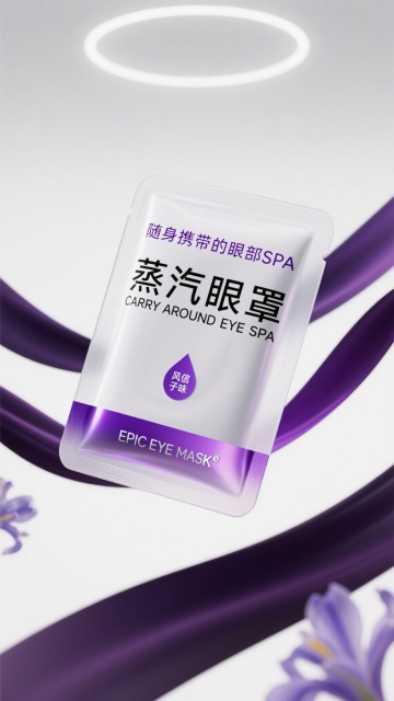 极简悬浮构图,纯净无瑕的白色背景上,一只半透明的磨砂玻璃材质蒸汽眼罩包装以15度角优雅倾斜,包装正面采用极简无衬线字体设计,上部是深紫色"随身携带的眼部SPA"中文标语,中部为黑色"蒸汽眼罩"主标题,下方是英文"CARRY AROUND EYE SPA",底部镶嵌一条渐变紫水晶质感条带,内嵌银色"EPIC EYE MASK"品牌标识,正中央悬浮着一枚水滴形风信子紫色全息标签,标注"风信子味"字样并散发出细微的紫色光晕。包装四周环绕着7条由深至浅渐变的紫色光带,如同被风吹动的丝绸般在纯净空间中流动,顶部45度角投射下柔和的环形天光,在包装边缘形成细腻的高光轮廓和渐变阴影,背景中隐约可见风信子花瓣的半透明纹理,整体呈现出高端SPA般的治愈氛围,完美平衡了科技感与自然舒缓的视觉语言。