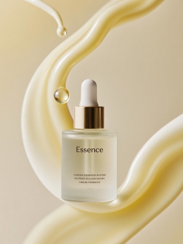 鎏金风与液态风交织,3D质感瓶身悬浮于水面,清透油滴轻落涟漪,白花点缀,光影流动间尽显奢华优雅与唯美感。