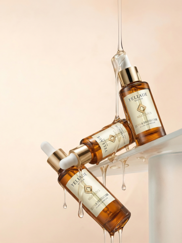 鎏金光影交织,液态质感流淌,3D重拟物风呈现奢华唯美的护发油瓶,花瓣轻漾水面,梦幻优雅尽显。