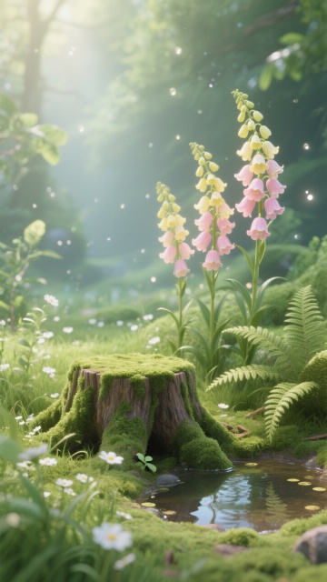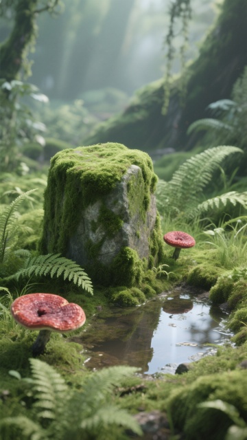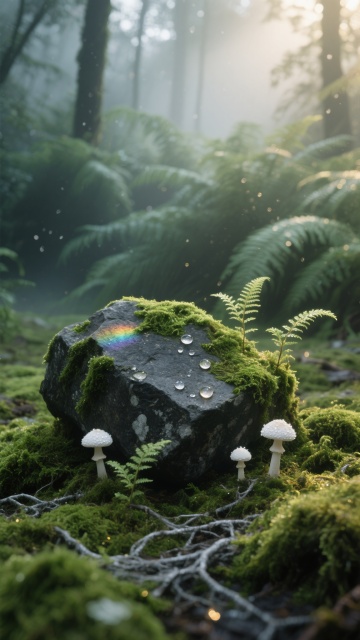 超写实摄影风格,俯视角微距镜头下的晨雾弥漫古老森林地表,画面以清新柔和的浅绿色渐变背景为主,营造宁静自然的氛围。前景是覆盖着绒毯般鲜绿苔藓的地面,苔藓呈现出细腻的纹理和饱满的质感,其间点缀着半透明的蕨类嫩芽和三朵顶戴珍珠晨露的白色小蘑菇,中央位置一块布满深绿苔藓的不规则灰黑色岩石被细密的银灰色菌丝网络温柔托举,岩石表面镶嵌着几粒折射彩虹光晕的露珠,边缘略显粗糙,整体形态自然质朴。构图采用近景特写,主体明确,景深控制得当,背景是逐渐虚化的深绿蕨类植物墙,空气中悬浮着肉眼可见的微小水汽颗粒,光线柔和均匀,从上方树冠缝隙中投下柔和晨光,在苔藓和岩石表面形成斑驳的金色光斑与微妙的光影变化,高光处露珠闪闪发光,阴影部分自然柔和,整体色调是多层次翡翠绿与苔藓灰的和谐交融,传达出清新、静谧、充满生机的自然之美。