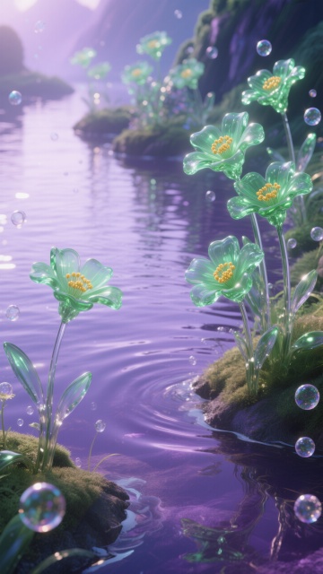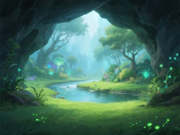 画面中所有物体都是玉质,前景是很多大小不同的红色玉质蘑菇,两侧层峦起伏,长满巨大的红色,青色玉质蘑菇和玉质灌木,以金色勾勒细节。画面中间可以看到玉质平静湖面,青色玉质山峰前有白色玉质祥云,玉质月亮在画面中间位置,月亮前景有白玉祥云,营造神秘温润意境