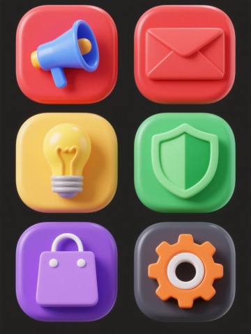 一套6张系列素材集合,每张均为规整排布的单一元素造型图案,保持简约现代风格,采用纯色背景。第一张:半透明渐变红色礼盒,顶部系着金色蝴蝶结,礼盒呈现轻微立体感,边缘有柔和高光和阴影,整体通透光滑;第二张:半透明渐变优惠券,带有虚线剪切边和折扣标识,保持与礼盒一致的光影质感和简约设计;第三张:半透明渐变喇叭造型,喇叭口朝右,线条流畅,体现现代简约风格;第四张:半透明渐变鼓掌手势,双手掌心相对呈鼓掌状,手指圆润,保持整体通透感;第五张:半透明渐变一堆金币,金币堆叠呈金字塔状,表面有光泽,体现金属质感;第六张:半透明渐变购物车,车筐为网格状,带有把手和轮子,造型简约现代,所有元素均保持统一的半透明渐变效果、光影处理和简约设计语言。