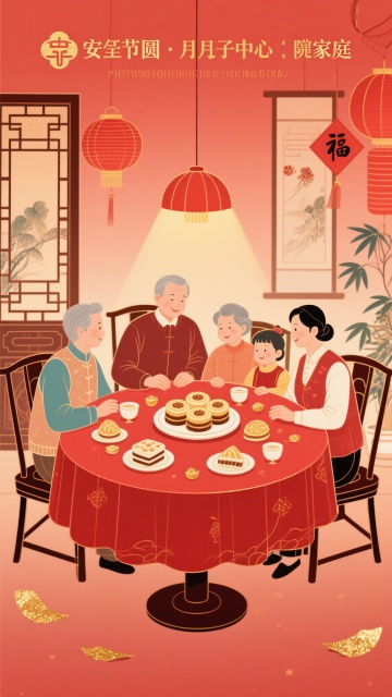 中式插画风,温馨中秋夜,家人团聚赏月,共品月饼,花影婆娑。
