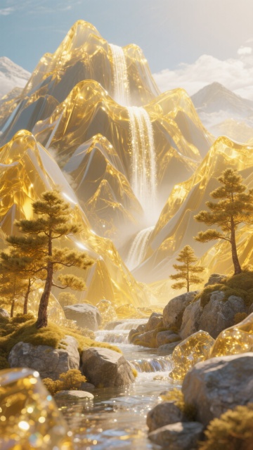 金色与落日橙交织的飘逸绸缎如流水般环绕,其上点缀着璀璨金箔与细碎光点,托起层叠起伏的青绿山水,山体纹理细腻并饰有金色纹路,山间挺立着苍劲青松,背景中落日余晖洒落,染红天际,几只飞鸟掠过山峦,整体呈现出中式典雅的3D立体效果,光影柔和,色彩浓郁且和谐,营造出华丽而宁静的氛围。