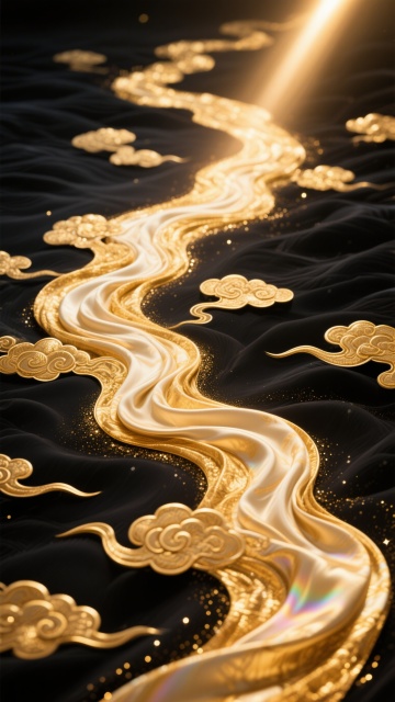 俯瞰视角,一幅融合东方山水意境与抽象表现主义的巨幅画卷,整体以流动的金箔色与纯净的象牙白为主调,金色从深琥珀色向珍珠母贝光泽渐变,如同晨曦中的云海漫过山峦。画面中,粗犷而富有韵律的笔触巧妙地勾勒出层叠的远山轮廓与蜿蜒的江河脉络,厚重的颜料堆积处形成险峻的山峰肌理,轻盈扫过的笔触则化作波光粼粼的湖面涟漪。右上方斜射的光线在金色山峦的凸起处形成耀眼的高光,凹陷的峡谷则沉淀为深邃的暗影,光影交错间仿佛能听见山间清泉流淌之声。金色的云雾在象牙白的空间中流动,隐约浮现出传统水墨的留白意境,整体氛围既奢华璀璨又不失东方禅意的空灵悠远。