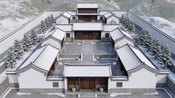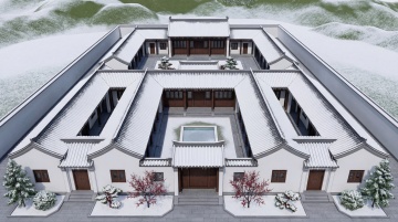 中式庭院融梦幻与温馨,软3D毛发生长风呈现可爱卡通感,雪中红梅与暖灯交织,营造冬日节日氛围。