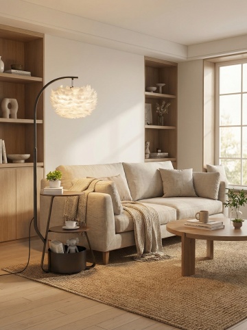 明亮柔和的自然光洒满整个空间,采用极简北欧风格设计,以米白色、浅木色和原木色为主色调,温暖而治愈的氛围。画面中展示的是一个变换了不同家具环境的客厅,整体构图保持对称美学与开放式布局,光线从左侧窗户斜射进来,在浅色木地板和条纹地毯上形成清晰的光影层次。墙上挂着两幅简约线条的植物装饰画,搭配原木边框。左侧有一盏弧形黄铜落地灯,灯光柔和,旁边摆放着一盆绿植。中央是一张浅灰色布艺沙发,搭配几个不同纹理的浅色系靠垫,沙发前是一张原木色茶几,上面整齐摆放着几本书籍和一个小巧的陶瓷花瓶。整体画面质感细腻,线条简洁流畅,空间通透,营造出舒适、宁静且温馨的居家氛围。