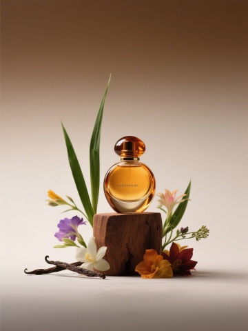 琥珀色香水瓶置于木雕基座,环绕花卉与香草,3D重拟物风呈现奢华优雅,光影柔和,实景质感十足,尽显文艺舒适之韵。