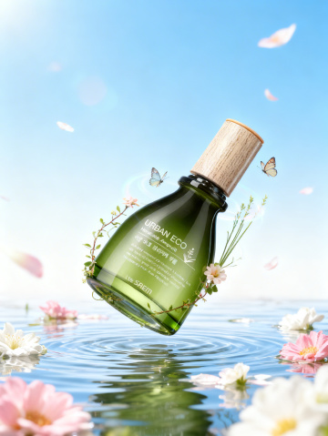 清新玻璃瓶置于虚拟自然水景中,花影轻舞,尽显清爽与清透感。