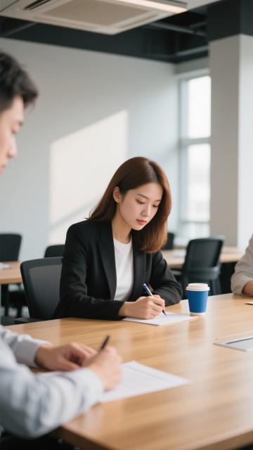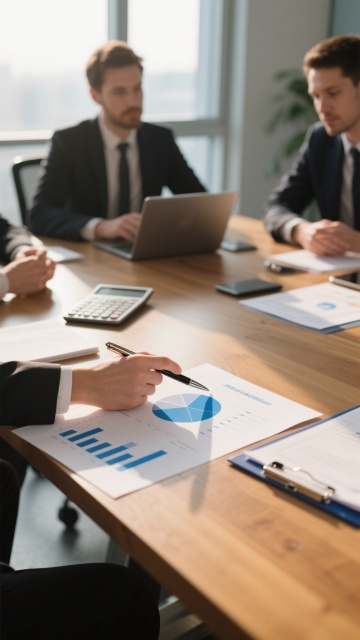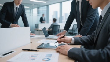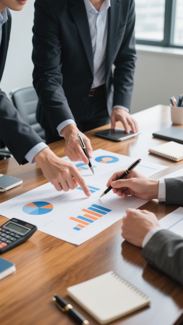 一张高清写实风格的商务工作场景照片,画面聚焦于几位身着正式西装的商务人士正在不同办公环境中协作工作的场景。光线明亮柔和,采用自然光源,色调以专业的蓝灰色系为主,搭配白色和浅木色的办公家具,营造出专业、高效、现代的办公氛围。前景中,人物的手部动作清晰,或正在使用平板电脑查看数据图表,或在文件上进行标注,手指细节和服装质感(如西装面料的纹理、衬衫的挺括)表现细腻。办公桌上整齐摆放着带有数据图表的文件、笔记本电脑、钢笔等办公用品,图表线条清晰,数据可视化效果专业。背景可根据不同场景进行调整,如开放式办公区、独立办公室、会议室等,保持整体构图采用三分法,主体人物位于画面中心偏下位置,背景环境元素(如办公隔断、同事、窗外城市景观等)虚化处理以突出主体,同时保持画面的纵深感和空间感。整体画面具有清晰的视觉层次,色彩和谐统一,光影过渡自然,细节丰富,充分展现商务人士专注、协作的工作状态,符合现代企业高效专业的形象定位。