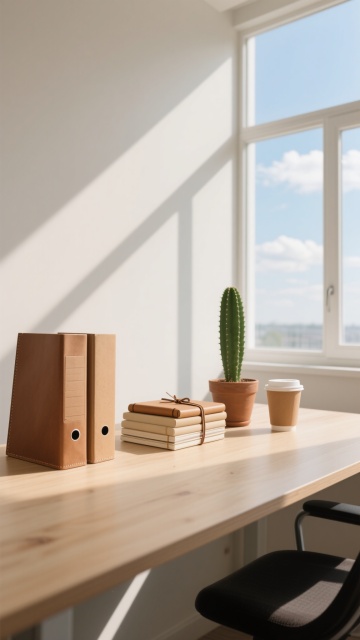 一个人正在书桌前专注地整理文件,手中拿着笔在笔记本上写字,桌面上整齐摆放着多个文件夹和打开的笔记本,阳光透过窗户洒在桌面上,营造出安静有序的工作氛围,体现出梳理信息、准备素材的场景