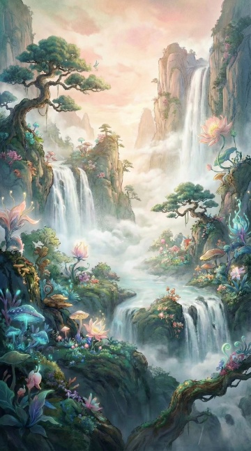 九维建筑设定,神女飞天,九维概念设定,仙境,低饱和度,薄荷色调,电影大片,华丽,3D,震撼,宏大场景,九维中国风,光荧斑驳,唯美插画,超级细节,超级繁复,九维云花海空间,古风大秦阿房宫,岩彩板绘,新九维,奢华,闪耀流苏,国风光影,九维粒子,亮片,生物发光粒子,64K高清,远景,虚幻引擎5,古风。画面中没有文字,请生成竖屏尺寸。