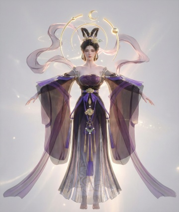 画面采用强透视中央构图,充满张力,小兔子在画面中央背对镜头面向女神,体型渺小且仰视神女,女神正面面向镜头,背景宏大并睥睨天下,神女发丝轻盈飘落并带有宿命感,手指为机械,手臂为皮肤,机械与皮肤过渡自然,嫦娥手指轻触小白兔,手指与小兔接触处有金沙线条并散发出金色光晕,小兔呈现机械化转变,周边有金色光点,整体融合超现实主义、飘渺感、独特造型、大师设计的夸张元素与中式风格,并带有孤独感和末世氛围,色调为暗