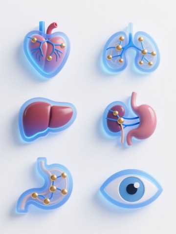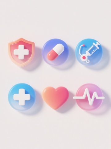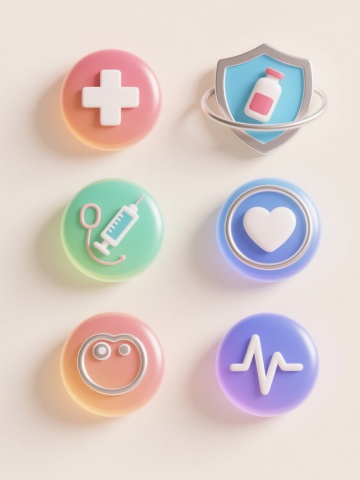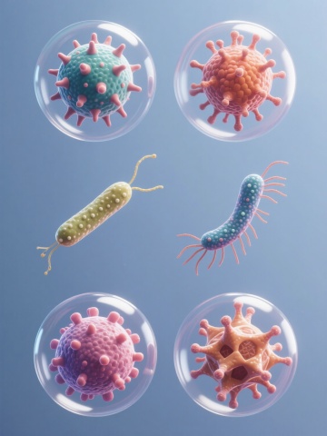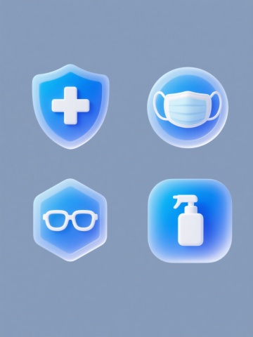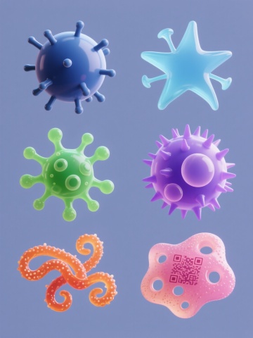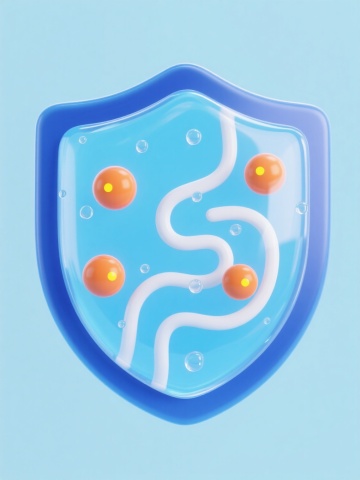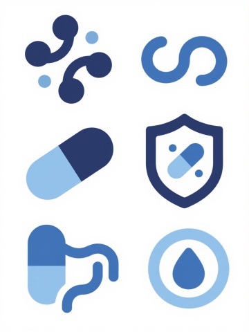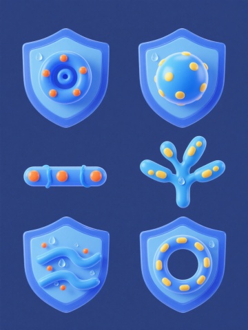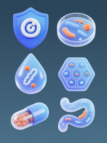 一组六个规整排布的益生菌系列素材集合,每个元素均采用相同的3D立体图标风格,纯净的纯色背景,整体色调以清新明亮的蓝色为主,搭配活力橙黄色点缀。每个图标都具有光滑圆润的边缘、半透明渐变的质感和细腻的高光阴影效果,呈现出通透的玻璃态材质感。第一个图标是蓝色盾牌内包裹着白色螺旋状益生菌和橙色菌球;第二个图标是蓝色胶囊造型,内部可见橙色益生菌菌群和流动的透明液体;第三个图标是蓝色圆形培养皿,里面有多个橙色益生菌球体和白色菌群链条;第四个图标是蓝色水滴形状,内部包含橙色菌球和白色波浪状菌群结构;第五个图标是蓝色六边形蜂窝结构,每个蜂窝格内都有不同形态的橙色益生菌和白色菌群;第六个图标是蓝色试管造型,管内装有透明液体,漂浮着橙色益生菌球体和白色螺旋状菌群。所有图标均保持一致的光影处理,边缘有一圈深蓝色描边,内部有细小的气泡细节,整体风格统一、清新、科技感十足,突出益生菌的健康、活性和保护特性。