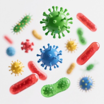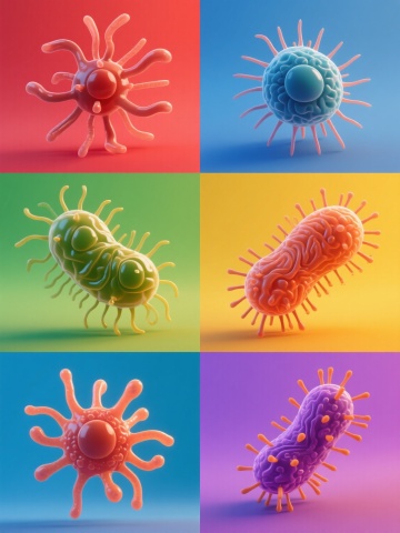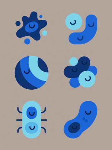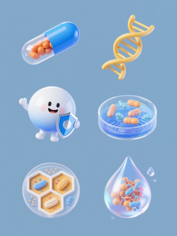 六个完全不同的益生菌主题元素规整排布在纯色背景上,每个元素均采用3D卡通风格,保持明亮通透的蓝白渐变色调、圆润光滑的边缘处理、半透明液体质感及悬浮水滴效果。元素包括:1. 蓝色胶囊外壳包裹橙色菌群内核的益生菌胶囊,表面有流线型光泽;2. 螺旋状DNA链环绕黄色活性菌群的分子结构模型;3. 微笑表情的拟人化益生菌球体,手持微型盾牌;4. 培养皿造型容器中漂浮的菌群群落,底部有波纹状液体;5. 六边形