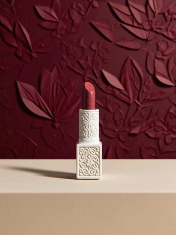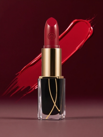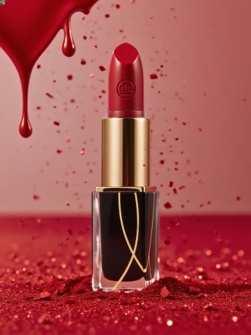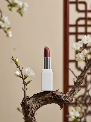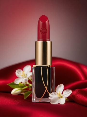 以暖黄为主色调,搭配口红的粉调、瓶身的金棕与花枝的浅黄,营造出温暖、优雅且精致的氛围,尽显美妆品的魅力。