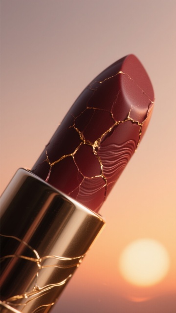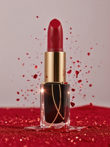 暖黄绸缎、蝴蝶结与柔和光影交融,搭配口红粉调、瓶身金棕,营造出优雅华贵又温暖的氛围,尽显美妆品精致感。