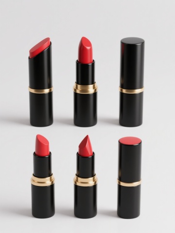 6个造型各异的同系列口红产品集合,每个口红均保持黑色哑光圆柱形外壳与金色金属圈装饰的统一设计语言,口红膏体为鲜艳正红色并展现不同造型(如斜切面、圆顶、棱角分明、微弧面、尖锥形、扁平切面),采用纯白色纯色背景,保持3D渲染的光滑质感与清晰光影(柔和顶部光源,底部轻微阴影增强立体感),所有口红以规整的2x3网格排布,形成视觉协调且富有变化的系列素材集合