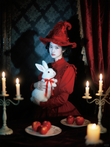 哥特风格与油画风交融,复古红衣少女怀抱白兔,烛光映衬神秘梦幻,古典优雅中透出奢华文艺感。
