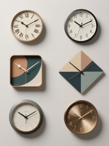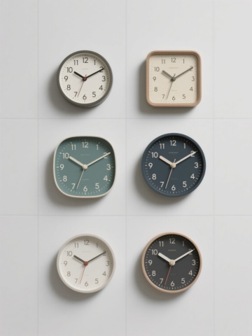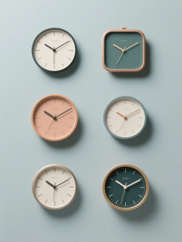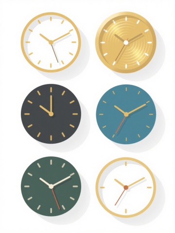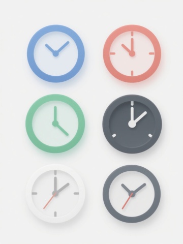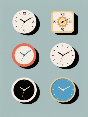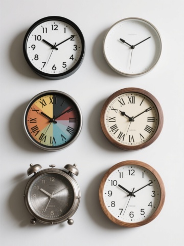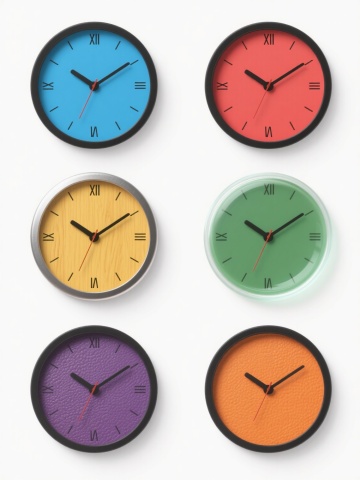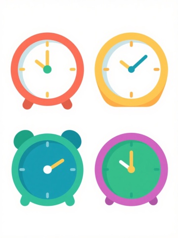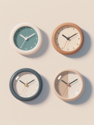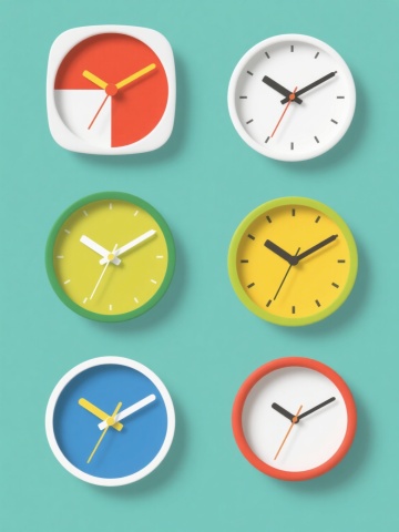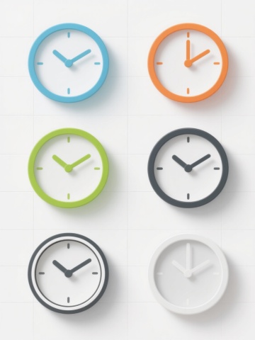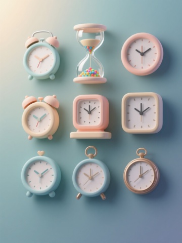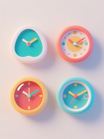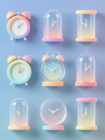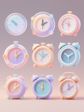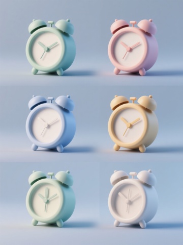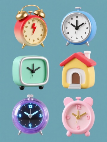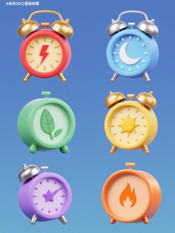 一套6张的3D风格系列素材集合,每张素材均为规整排布的单一闹钟图案,闹钟整体造型简约现代,采用纯色背景,无任何文字、logo和水印。第一张:红色渐变外壳的双铃闹钟,金色金属装饰,表盘中央有红色闪电图案,表盘为米黄色,金色刻度和指针,金色支架。第二张:蓝色渐变外壳的圆形闹钟,银色金属边框,表盘为白色,黑色数字和指针,顶部有一个银色提手。第三张:绿色磨砂质感的方形闹钟,黑色数字和指针,表盘为浅绿色,四个角有银色金属包边,底部有四个黑色防滑垫。第四张:黄色光滑外壳的卡通闹钟,造型像一个小房子,红色屋顶,白色表盘,黑色数字和指针,门口有一个小台阶。第五张:紫色透明外壳的球形闹钟,内部有蓝色LED灯,表盘为黑色,白色数字和指针,顶部有一个银色按钮。第六张:粉色软胶材质的椭圆形闹钟,表盘为浅粉色,金色数字和指针,顶部有两个粉色的小耳朵,底部有两个粉色的小脚丫。