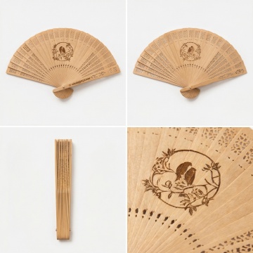 一组6个不同造型、不同形状、不同样式的扇子素材集合,规整排布在纯色背景上。保持中国传统工笔画风格,细腻的线条勾勒,淡雅的色彩晕染,柔和的光影效果,营造出宁静雅致的氛围。每个扇子都有独特的设计:有的是圆形扇面,绘有盛开的梅花;有的是椭圆形扇面,描绘着竹林景象;有的是六边形扇面,展现出山水风光;有的是花瓣形扇面,刻画着花鸟图案;有的是长方形扇面,书写着古典诗词;还有的是异形扇面,设计新颖独特。扇骨采用木质纹理,扇面材质轻盈通透,整体画面和谐统一,具有浓郁的东方艺术韵味。