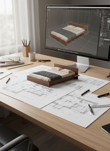 "精致的建筑模型场景,微缩的现代风格室内空间模型放置在建筑图纸上,包含简约木质家具(书柜、椅子、小桌、沙发)和白色台面的开放式厨房。模型下方是带有线条标注的建筑平面图,背景中散落着卷起的图纸和更多木质家具模型。整体采用柔和自然光照明,突出模型的立体感与材质纹理,色调以原木色、白色和浅灰色为主,营造专业、细腻的建筑设计氛围,画面聚焦于模型细节,背景适度虚化。"