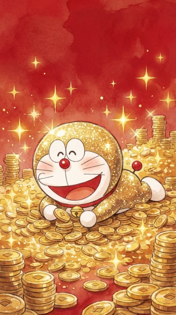 软3D风格的哆啦A梦,毛发生长质感搭配卡通笑脸与金币环绕,喜庆梦幻,体积感十足,传递节日欢乐氛围。