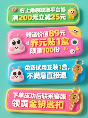 软3D风+粘土质感,拟人化小萌物点缀,卡通感十足,色彩明亮活泼,营造可爱促销氛围,强化节日优惠信息传达。