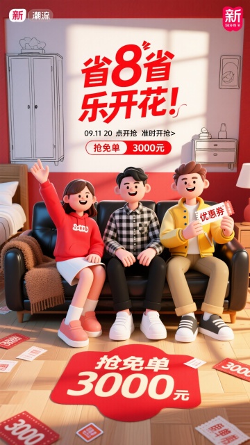 软3D风格卡通人物,拟人化设计,塑料质感细节,喜庆红主色系,结合促销信息与节日氛围,营造轻松欢乐的购物体验。