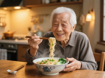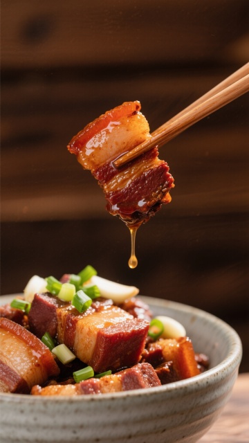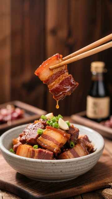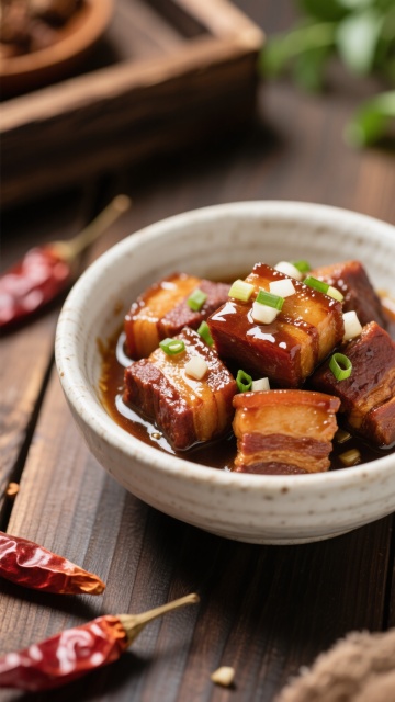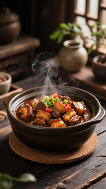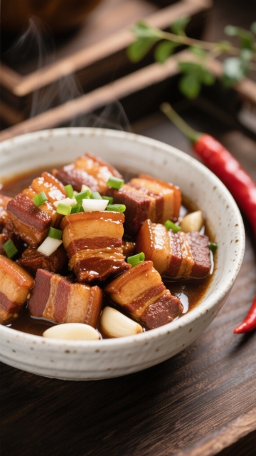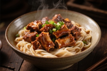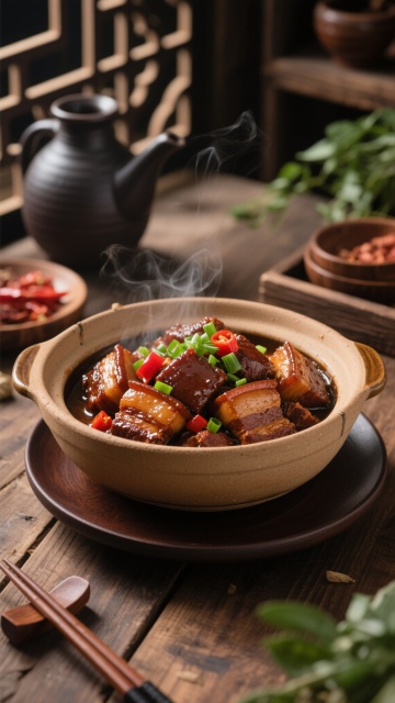 超写实美食摄影风格,一碗热气腾腾的中式面条,深棕色浓郁汤汁,面条被木筷挑起呈现自然垂坠感,碗中点缀大块炖煮至软烂的酱色肉块、翠绿香菜和葱花,碗边散落鲜红完整干辣椒,背景为古朴木质纹理与中式格栅窗的模糊剪影,整体暖色调(棕红、赭石、暖黄为主),侧上方柔和主光源形成明显高光与阴影对比,突出食物质感与立体感,大面积留白处理增强画面呼吸感与简约高级感,木质桌面纹理清晰,整体氛围温暖诱人,细节丰富,色彩和谐统一。