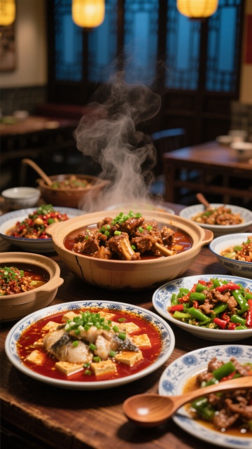 热气腾腾的重庆火锅,沸腾的红油锅底点缀着辣椒和花椒,周围摆放着新鲜的肥牛卷、虾滑、毛肚、鸭肠、蔬菜拼盘等食材,暖色调灯光营造出温馨热闹的氛围,木质餐桌上摆满了各式菜品,蒸汽袅袅升起,充满食欲感和烟火气