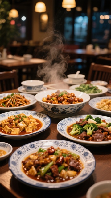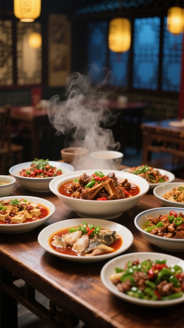 热气腾腾的鸳鸯火锅冒着浓郁香气,锅中翻滚着鲜红的麻辣汤底和清亮的菌汤,周围摆满肥牛卷、虾滑、毛肚、青菜等各色食材,木质餐桌上铺着传统花纹餐布,背景是古色古香的中式屏风和红灯笼,营造出温馨热闹的火锅盛宴氛围,整体呈现出温暖诱人的色调和丰富的层次感,充满地道的中式火锅文化气息。
