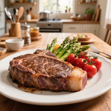 节日氛围,青花瓷盘中盛放着色泽红亮的糖醋排骨,热气腾腾,旁边点缀着翠绿的葱花和鲜红的小番茄,背景是温馨的暖色调灯光,家人围坐的餐桌一角,充满烟火气,“青花盘中的糖醋排骨|是家人围坐的烟火气”