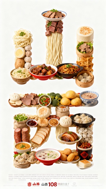 中式古典禅意场景,以3D浮雕风呈现“大同”二字,面条与食材巧妙构成文字,重拟物设计融合神圣感与体积感,传递节日美食文化。