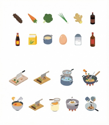 【中国传统美食系列素材集合】纯色背景,扁平化设计风格,整体采用高饱和度暖色调(红色、橙色、黄色为主),画面中包含多种中式菜肴,有炖品、炒菜、点心、汤羹等,各类菜品用不同形状和颜色的餐具盛放,餐具设计简约现代,所有元素规整排布,形成有序的视觉节奏,无文字信息,适合作为餐饮相关的系列素材使用。