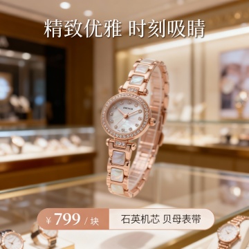 奢华感与优雅感交织,金属风表壳搭配皮质风表带,重拟物风礼盒呈现真实质感,浮雕风细节凸显精致工艺,节日氛围浓厚。
