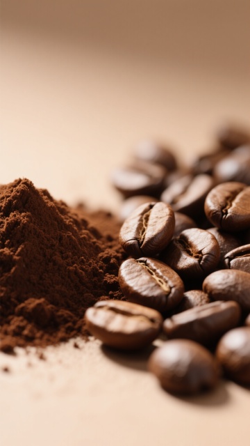 高清特写摄影,左侧为细腻的深褐色咖啡粉,右侧为饱满的烘焙咖啡豆,两种形态自然过渡,咖啡豆表面纹理清晰,呈现出从深棕到浅褐的丰富色调变化,整体画面以暖棕色为主,光线柔和地从上方照射,形成细微的高光与阴影对比,营造出浓郁、温暖、质感十足的咖啡氛围,背景简洁无其他元素,突出咖啡本身的原始质感与自然美感。