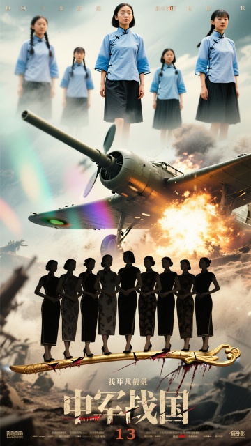电影海报构图,中式美学风格,背景:抗日战争的炮火,飞机大炮;画面下方为很大很大的13个旗袍女子的剪影,共同站在一枝金色的簪子上,簪子上伤痕累累,突出视觉焦点。海报上方为模糊的几个很小很小穿着中华民国时期学生装上身是蓝色衣服,下身是黑色裙子的女孩子,,呈现高斯模糊与炫彩光影叠化效果,增强梦幻氛围。(尝试做的电影《金陵十三钗》的海报)
