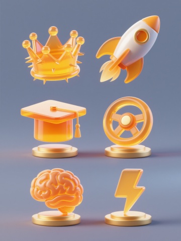 一套6张系列素材集合,每张均为简约现代风格的单一元素图案,规整排布。保持与原图一致的3D渲染质感,金色金属材质,光滑表面带有细腻高光和阴影,纯色背景。第一张:带有五角星浮雕的双耳奖杯,杯身圆润,底座有菱形纹路;第二张:简约线条设计的单耳流线型奖杯,杯口呈倾斜角度,底座为圆形;第三张:多层阶梯式底座的高脚杯造型奖杯,杯身两侧有对称弧形装饰;第四张:带有环形握手设计的方形杯身奖杯,表面有横向条纹肌理;第五张:顶部带有月桂叶环绕装饰的古典风格奖杯,底座为六边形;第六张:几何切割面构成的现代感奖杯,杯身有三角形镂空设计,整体棱角分明。所有奖杯均居中放置,保持统一的光影效果和视觉比重,强调金属的光泽感和立体感。