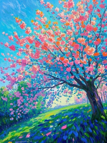 油画风印象画派,梦幻清新,色彩斑斓的花树在春风中绽放。