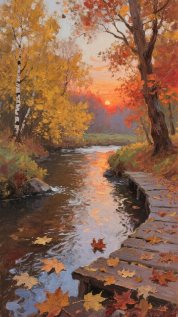 厚涂油画风秋天的溪景,暖阳映水,落叶纷飞,光影流动间尽显静谧唯美感,文艺气息浓郁,印象画派笔触勾勒自然诗意。