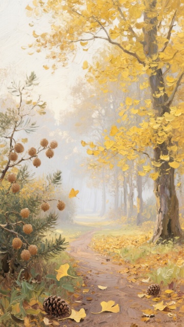 秋天林径,金黄落叶铺满小路,厚涂笔触营造朦胧柔和的油画质感,静谧唯美中透出文艺气息,宛如印象画派的诗意画卷。