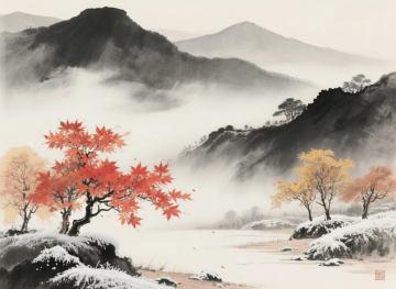 水墨风与工笔技法交融,红枫点缀雪境,山雾缭绕,虚实相生,营造出中式静谧意境,展现冬日里的自然诗意。