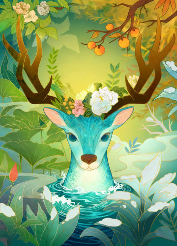 一只雪白带有金色斑点的神鹿在色彩绚烂的抽象背景中奔跑,它的姿态轻盈优雅,头顶巨大的树枝状金色鹿角伸向空中。背景以橙红、金黄、深蓝为主色调,充满流动感的漩涡状云彩和火焰般的纹理,点缀着发光的圆形花纹和细小的白色光点,上方是一轮巨大的金色满月,月面上有华丽的卷草纹装饰,整体画面呈现出浓厚的装饰艺术风格和梦幻华丽的氛围,色彩浓郁饱和,线条流畅富有动感,充满神秘而神圣的气息。