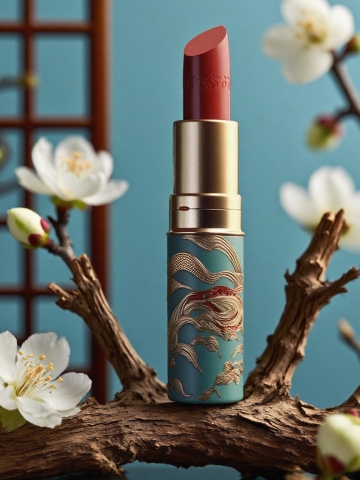 以暖黄为主色调,搭配口红的粉调、瓶身的金棕与花枝的浅黄,营造出温暖、优雅且精致的氛围,尽显美妆品的魅力。
