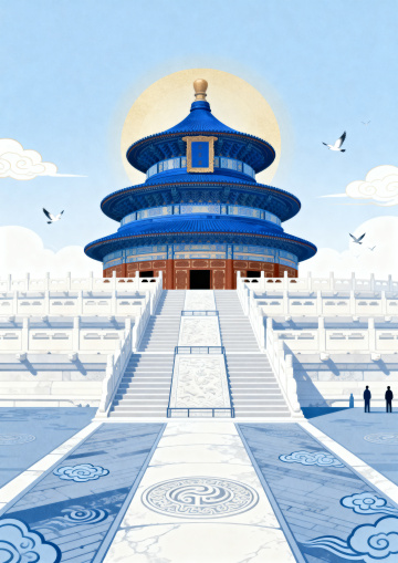 国潮风插画,融合中式建筑与梦幻月色,鎏金剪影勾勒天坛轮廓,水彩质感渲染水面倒影,玉兔静坐涟漪中央,唯美感十足,中秋佳节氛围浓厚。