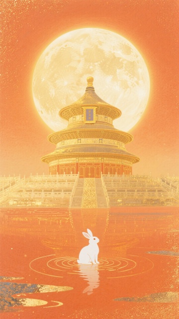 国潮风插画,天坛剪影映月,鎏金粒子点缀,白兔静坐水面泛涟漪,中式古典与梦幻唯美感交织,中秋节日氛围浓厚。