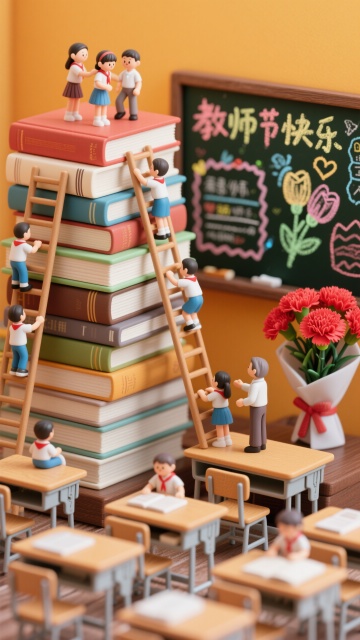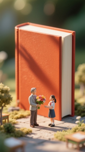 3D微缩艺术风,简约温馨场景,学生给老师赠花,书本为背景,清新自然。