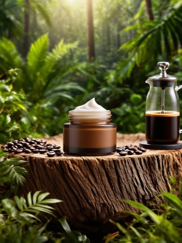 精致的白色乳霜置于铺满翠绿苔藓的原木之上,周围散落着棕色颗粒状物体,背景为模糊的绿色植物与几片带水珠的翠绿叶子,整体呈现清新自然的水彩画风格,柔和的笔触,通透的色彩晕染,细腻的纹理表现,光影柔和,营造宁静自然的氛围,构图以原木和苔藓为主体,乳霜为视觉焦点,背景虚化突出主体。